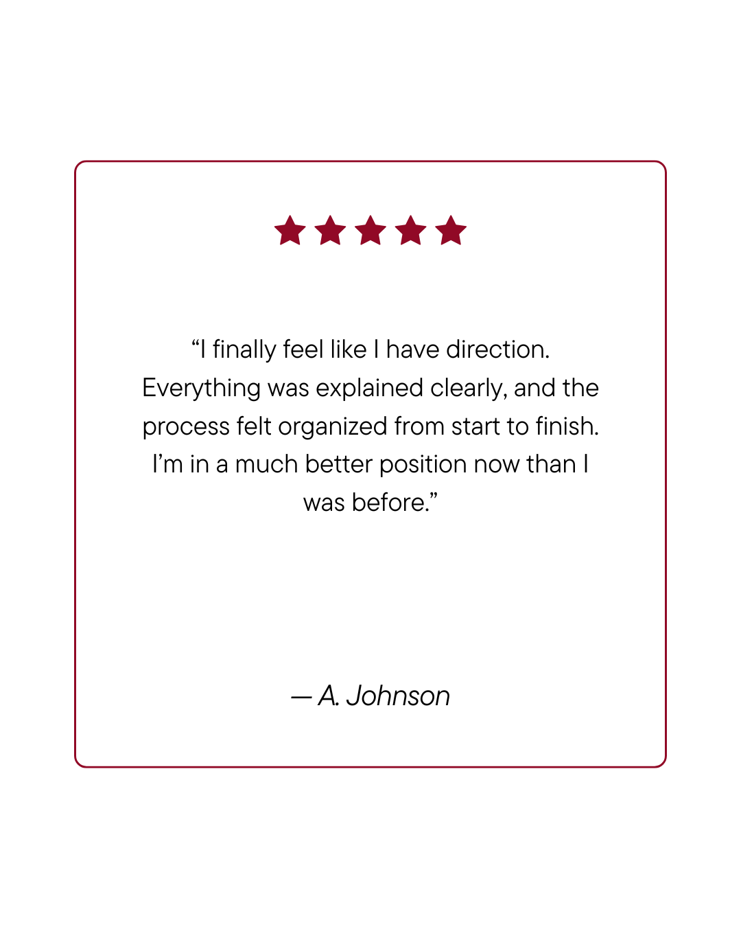 A personalized plan is created to strengthen your overall financial position and address key obstacles.